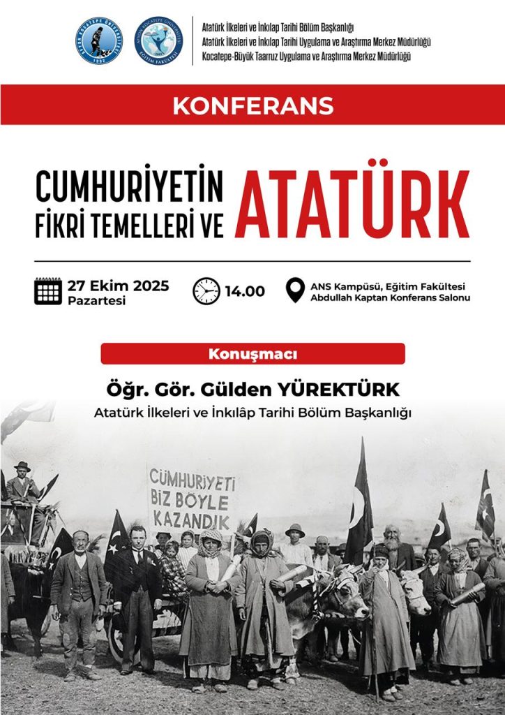 Afyon Kocatepe Üniversitesi Atatürk İlkeleri ve İnkılap Tarihi Bölüm Başkanlığı Öğretim Görevlisi Gülden YÜREKTÜRK tarafından 27 Ekim 2025 Pazartesi günü saat 14:00’de Eğitim Fakültesi Abdullah Kaptan Konferans Salonunda Cumhuriyetin Fikri Temelleri ve Atatürk başlıklı konferans gerçekleştirilecektir. Tüm öğrencilerimizi konferansımıza bekleriz.